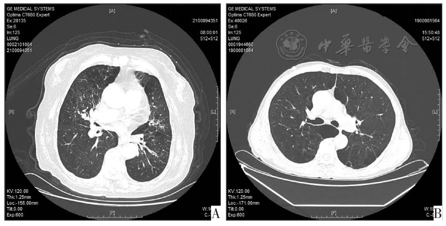 图1 COPD伴肺气肿患者典型CT图像。图A为EOS型COPD伴肺气肿患者CT图,大片透亮区,肺小叶破坏严重,呈低密度、无壁、不规则状;图B为非EOS型COPD伴肺气肿患者CT图,小叶中央型气肿区域较小,呈斑片状,肺纹理和小血管数量减少